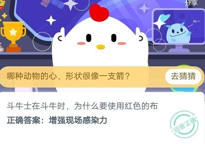 你们知道在支付宝蚂蚁庄园的玩法中,今天的题目,斗牛士在斗牛时为什么要使用红色的布?游戏爱好者小编分享了蚂蚁庄园答题攻略,一起看看吧。斗牛士在斗牛时为什么要使用红色的布答案:增强现场感染力答案解析::对颜色的分辨能力很弱,在斗牛场上,让牛激动的并不是斗牛布的颜色,而是斗牛布晃动的程度。红色的斗牛布主要是为了激起观众的情绪,让观众兴奋起来,增强现场的感染力哦。蚂蚁庄园怎么玩继蚂蚁森林种树捐树后,支付宝