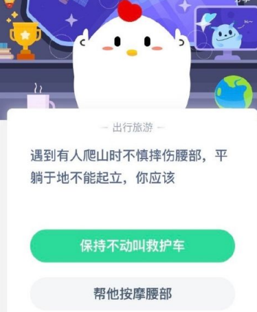 支付宝蚂蚁庄园的答题问题是比较丰富的,今天的题目是,遇到有人爬山时不慎摔伤腰部平躺于地不能起立你应该?答案是什么呢,游戏爱好者小编来为大家带来蚂蚁庄园答题攻略。遇到有人爬山时不慎摔伤腰部平躺于地不能起立你应该答案:保持不动叫救护车答案解析:疑似脊柱骨折或者损伤的病人,切忌随意搬动,造成二次损伤,应等待专业的急救人员到达后再行处置。蚂蚁庄园怎么玩继蚂蚁森林种树捐树后,支付宝又在APP客户端中推出了蚂