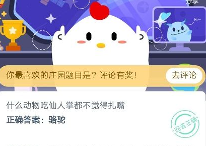 估计有的用户还不了解在支付宝蚂蚁庄园中今天的题目,什么动物吃仙人掌都不觉得扎嘴?下文小编就分享了蚂蚁庄园答题攻略,希望对你们有所帮助哦。什么动物吃仙人掌都不觉得扎嘴非洲鸵鸟骆驼答案:骆驼答案解析:骆驼吃仙人掌不用吐刺,主要是它们嘴巴构造特殊,里面长满圆锥形的“肉刺”,非常坚韧;骆驼不仅口腔、舌头、食管皮很厚,胃液也能消化尖刺,因此骆驼吃仙人掌不觉得扎。蚂蚁庄园怎么玩继蚂蚁森林种树捐树后,支付宝又在