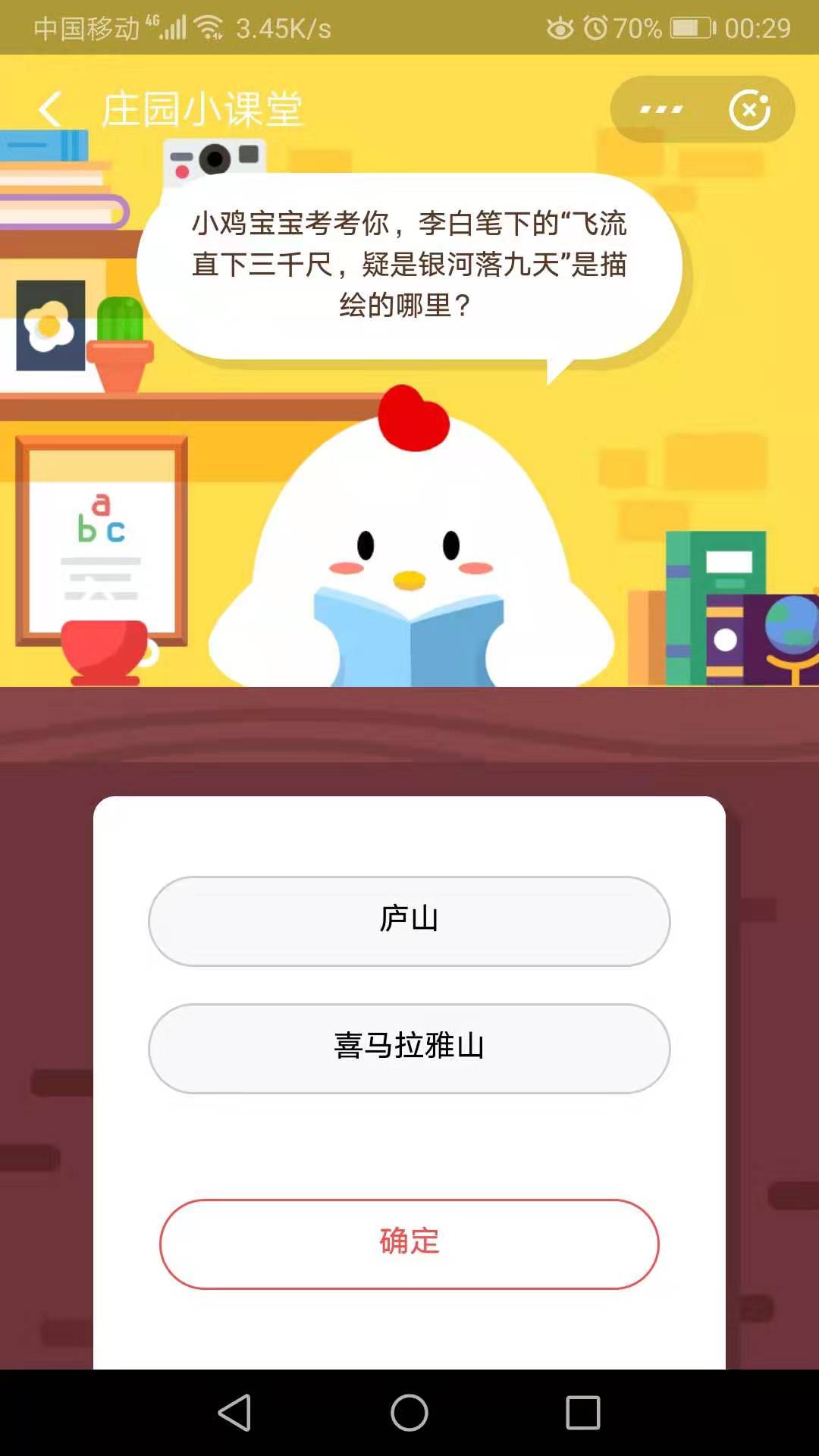 支付宝庄园小课堂每天都有新的问题,答对后才能领取小鸡饲料。7月30日的问题是:小鸡宝宝考考你,李白笔下的“飞流直下三千尺,疑是银河落九天”描绘的哪里?一起来看看蚂蚁庄园7月30日庄园小课堂答案吧。蚂蚁庄园7月30日庄园小课堂答案问题:小鸡宝宝考考你,李白笔下的