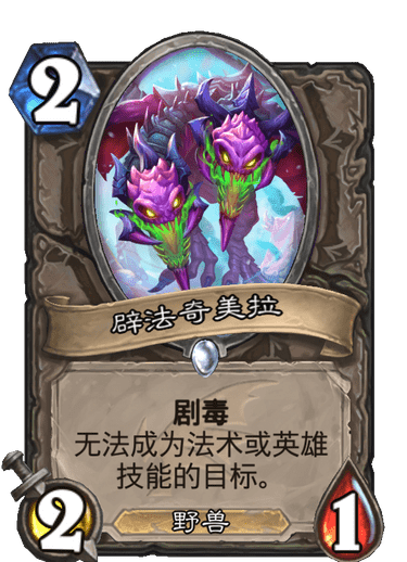 炉石传说是一款人气火爆游戏,巨龙降临版本的剧毒野兽辟法奇美拉,只要让它接触到,就可以毒死一只巨龙哦,那么今天小编就给大家带来炉石传说中立随从辟法奇美拉费用属性详解,感兴趣的小伙伴快来看看吧。中立普通随从辟法奇美拉2费 2/1剧毒,无法成为法术或英雄技能的目标野兽这张卡并不实用,比不过之前的两费剧毒嘲讽蜗牛。主要在于它的血量,剧毒并不需要攻击,而一点血量,则会被潜行者的匕首、德鲁伊变脸