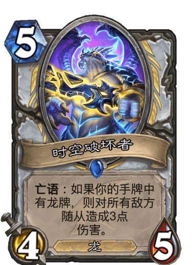 炉石传说巨龙降临牧师稀有随从时空破坏者效果介绍。正如他名字描述的那样,破坏,亡语带有正向AOE,就算身材差了点又算得了什么呢,那么这张卡具体是什么效果呢?一起来看看吧。炉石传说巨龙降临牧师稀有随从时空破坏者5费 4/5亡语:如果你的手牌中有龙牌,则对所有敌方随从造成3点伤害。龙这张卡看似身材差了点攻击,但是亡语效果爆炸,自身还带有龙种族,甚至可以将其看做7/5的身材来对待。集解场,占场,龙种为一体
