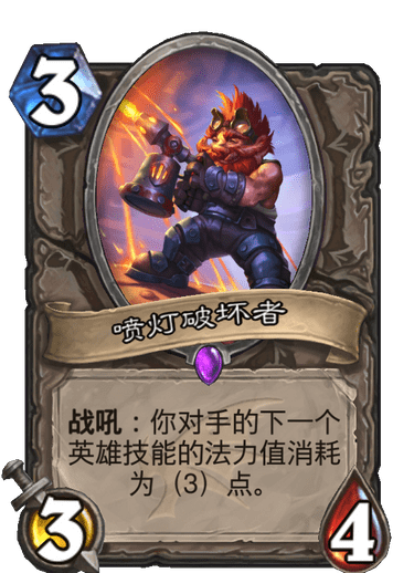 炉石传说是一款人气火爆游戏,炉石传说巨龙降临中立史诗随从喷灯破坏者效果介绍。喷灯破坏者会破坏对手的技能的费用情况,是持续性的却不是永久性的,那么今天小编就给大家带来炉石传说巨龙降临喷灯破坏者战吼效果介绍,感兴趣的小伙伴快来看看吧。炉石传说巨龙降临中立史诗随从喷灯破坏者3费 3/4战吼:你对手的下一个英雄技能的法力值消耗为(3)点。注意,该卡面描述是下个英雄技能的法力值消耗为(3)点,