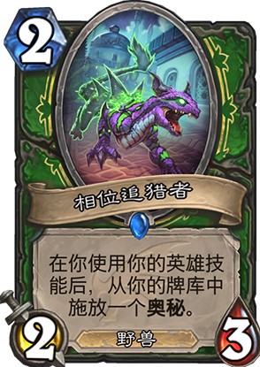 炉石传说是一款人气火爆的卡牌策略游戏,最近炉石传说巨龙降临扩展包即将发布,新卡发布是玩家们关心的重点,今天就给大家带来炉石传说巨龙降临新卡相位追猎者属性一览?跟小编一起来看看吧。 相位追猎者属性介绍: 费用:2费 攻击力:2 血量:3 品质:稀有 职业:猎人 所属卡牌包:巨龙降临 卡牌效果:在你使用你的英雄技能后,从你的牌库中施放一个奥秘。强度分析猎人已经好久不见职业卡有223