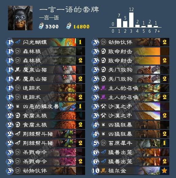 在经过一次又一次的平衡后,各大职业基本上都有一些强势卡组了,对于猎人来说有人惊讶的说,现在玩不起猎人了,当然除了宇宙猎和奥秘猎之外,经典的中速猎还也可以一战,卡组代码:AAECAR8EuwX27AKbhQOenQMNqAK1A94ElwjFCNsJgQrJ+A