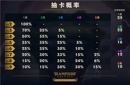 在LOL云顶之弈S2赛季中因为英雄棋子等大环境的改变,不少玩家还没有适应好新版本,那么云顶之弈s2抽卡概率怎么样?下面小编就为大家带来云顶之弈s2新赛季抽卡概率表分享,跟小编一起去看看吧。云顶之弈s2抽卡概率表在LOL云顶之弈9.22元素崛起版本更新后,不少玩家们对于新羁绊、新英雄都感到非常陌生,云顶之弈S2大环境的改变,不少小伙伴要重新开始熟悉游戏。LOL云顶之弈S2抽卡概率表:云顶之弈相关攻略