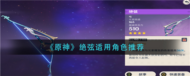 在原神游戏中绝弦是一个非常不错的四星武器,那么具体适用角色有哪些呢?对此,不了解的小伙伴,那就快来看看小编给大家准备的相关游戏内容吧! 《原神》绝弦适用角色推荐 首先绝弦适合【脱手C】,因为绝弦加的元素精通,就是用来给各种元素反应增伤的。给技能的增伤,也契合了脱手C这点。目前适合带绝弦的角色有如下几位。1、菲谢尔(皇女):脱手雷C,吃精通增伤,刚好大部分伤害都来自元素战技,契合度很高的武器。 2、